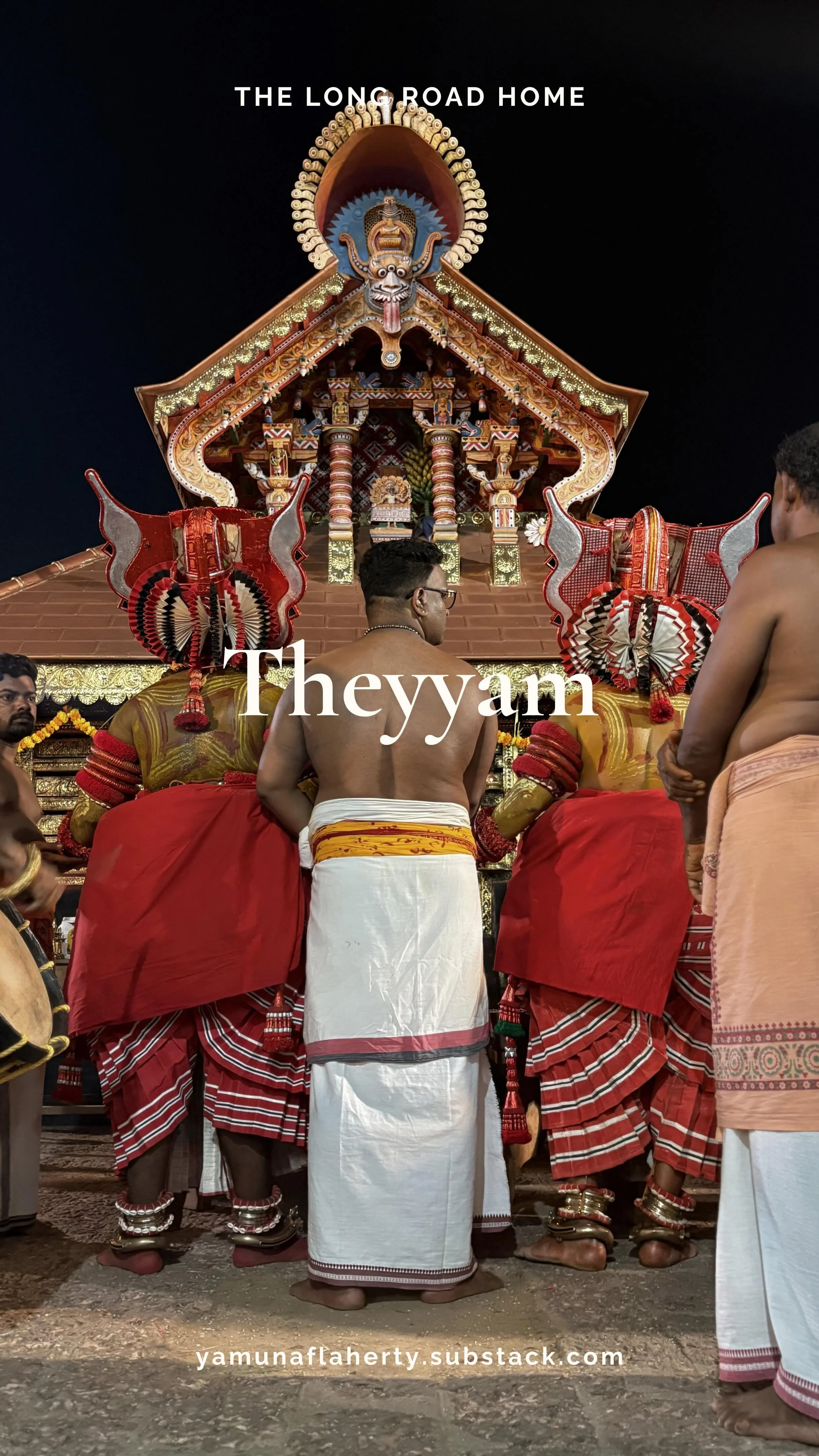In my latest piece, I step into a temple courtyard in North Kerala to witness Theyyam — a ritual where gods are not worshipped from afar but embodied in flesh and fire. Through drumbeat, oil lamps, red earth, and painted faces, this poem captures the night myth breathes again. It’s an offering about ritual, ancestry, and the thin veil between human and divine.